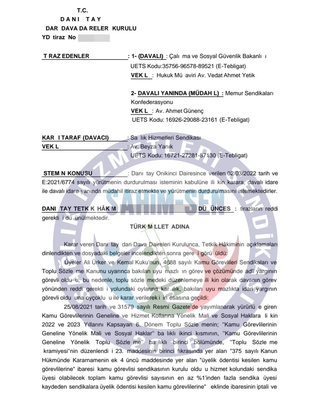 6.Toplu Sözleşmede üye sayısı yüzde biri sağlamayan sendikaların üyelerine toplu sözleşme ikramiyesi üç ayda bir ödenen miktarın ödenmeyeceği imza altına alındı. Bunun üzerine üye sayısı yüzde birin altında kalan sendikalar Danıştay'a yürütme durdurma talepli dava açıldı. Sahim Sen de bu davayı açan sendikalardan biridir. Dava devam ederken Danıştay yetkili sendikanında müdahil olmasını istemiş aka binde davada yürütme durdurma kararı alınıp yüzde birin altında kalan sendika üyeleri de üç ayda bir ödenen toplu sözleşme ikramiyesinden yararlanmaya başlamıştır. Yürütmeyi durdurma kararına bakanlık ve yetkili sendika itiraz etmiş lakin yürütme durdurma kararı 25/05/2022 tarihinde kesinleşmiştir .Sahada yanlış bilgilendirme yapan temsilcilerin beyanları asılsızdır. Hak hukuktan uzak yasal dayanakları bilemeyen sendikalara veya temsilcilerine itibar etmemenizi rica ederiz.Yetkili sendikanın haktan hukuktan uzak toplu sözleşme maddesi yargıdan geri dönmüştür.