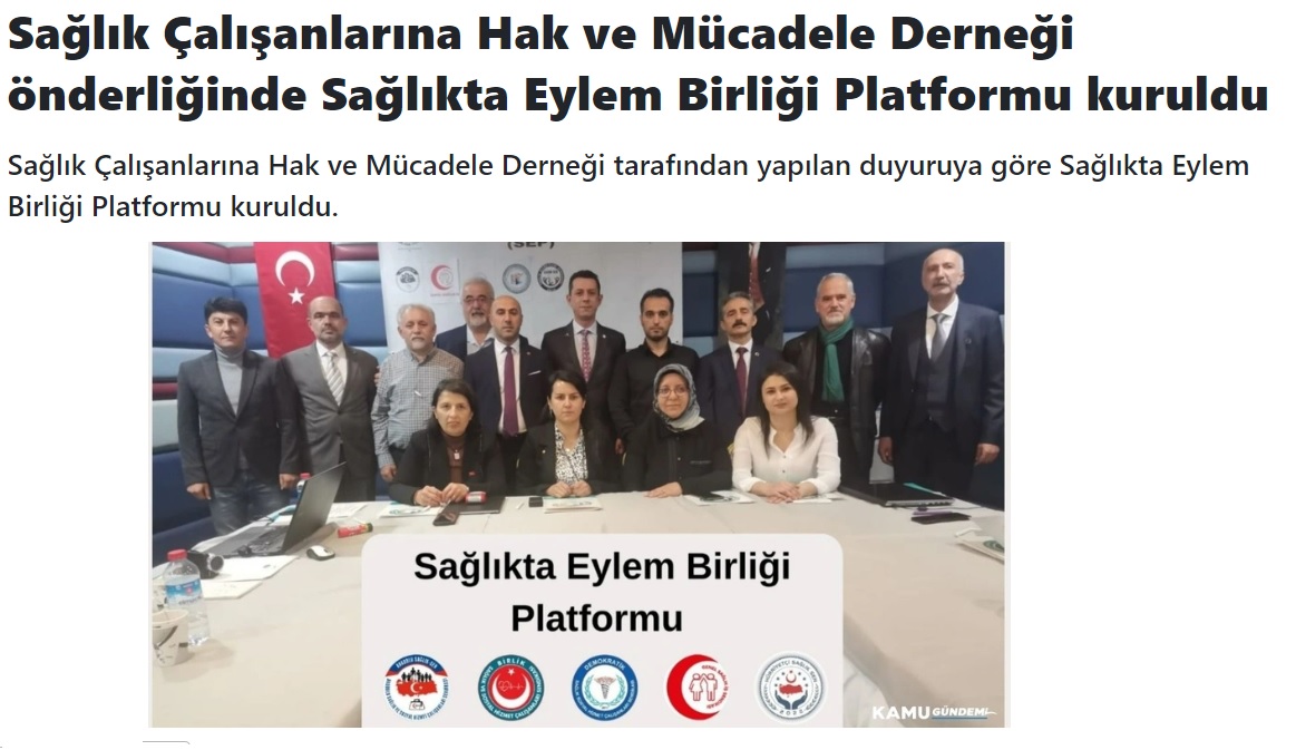 Sağlık Çalışanlarına Hak ve Mücadele Derneği tarafından yapılan duyuruya göre Sağlıkta Eylem Birliği Platformu kuruldu. Türkiye'de gerek sahada gerek çeşitli merciilerde ortak problemlerin çözülmesi adına söz birliği, eylem gerçekleştirme, ortak hareket etme gibi birçok taleplerin daha yüksek seslerde dile getirilmesi adına Sağlık Çalışanları Hak ve Mücadele Derneği öncülüğünde başlatılan Sağlıkta Eylem Birliği Platformunun ilk toplantısı 27.11.2022 tarihinde Ankara’da 10 meslek örgütü ve derneklerin bir araya gelmesiyle gerçekleştirildi.