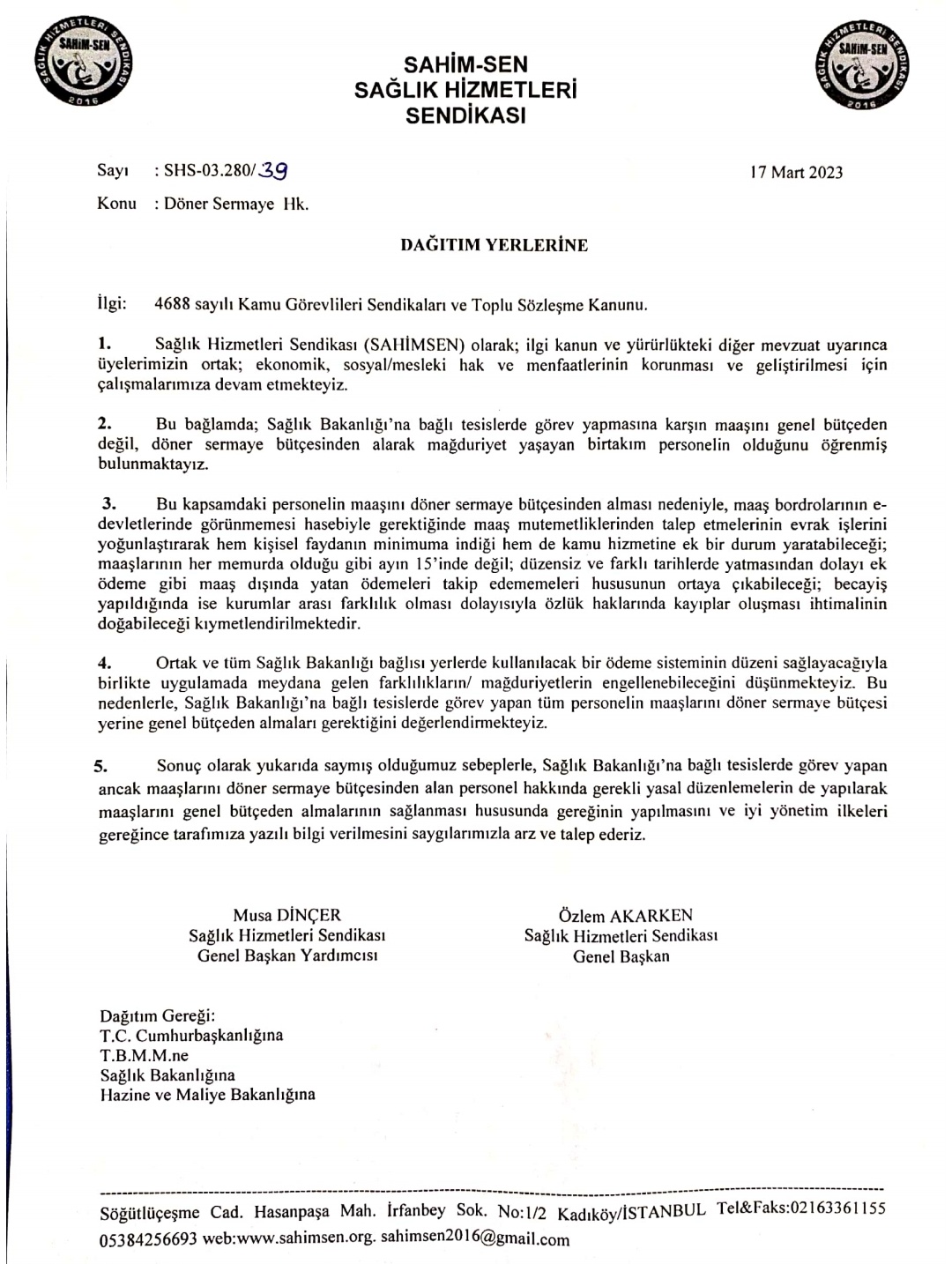 Döner Sermayeden Maaş Alan Kamu Personelinin Mağduriyetlerini gidermek adına başvurumuzu ilgili yerlere yaptık.