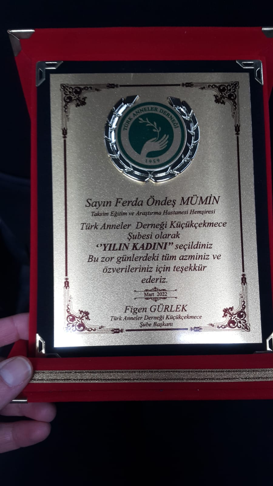 Üyemiz Ferda Öndeş Mümin tüm sağlık emekçisi arkadaşları adına kabul ettiği ödülle Türk Anneler Derneği Küçükçekmece Şubesi tarafından YILIN KADINI ödülüne layık görüldü. Sağlık emekçileri adına aldığı bu ödülle bizleri onurlandırdı gururlandırdı.
