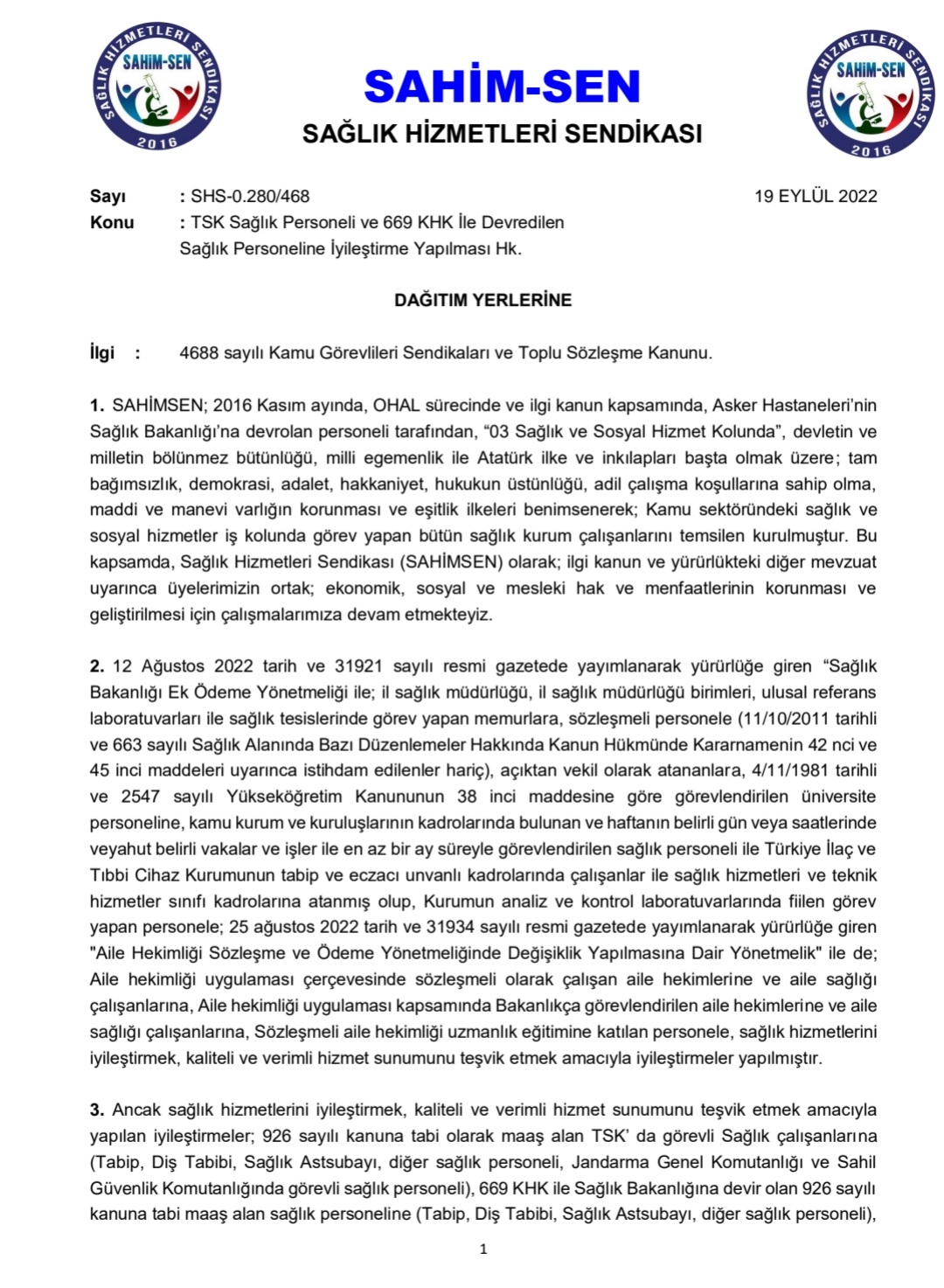 Bu yılın başında Sağlık Bakanlığı personeline yapılan iyileştirmeleri öngörerek, devrolan 926 sayılı kanuna tabi personelin ve TSK Sağlık personelinin maaşlarında iyilestirilme yapılması yönünde ilgili kurumlara yazımızı ilettik ve görüşmelerimiz başlattık. Gelinen noktada TSK'nın, yazdığımız yazı ve görüşmelerimiz doğrultusunda MSB'ye hitaben, TSK Sağlık çalışanlarına (Sb.,Astsubay, Sivil Me., ve diğer personel) yönelik iyileştirme yapılması yönünde resmi talep oluşturduğunu öğrendik. Bu doğrultuda çok daha kapsamlı bir şekilde talebimizi yineledik. Görüşmelerimiz devam etmektedir.