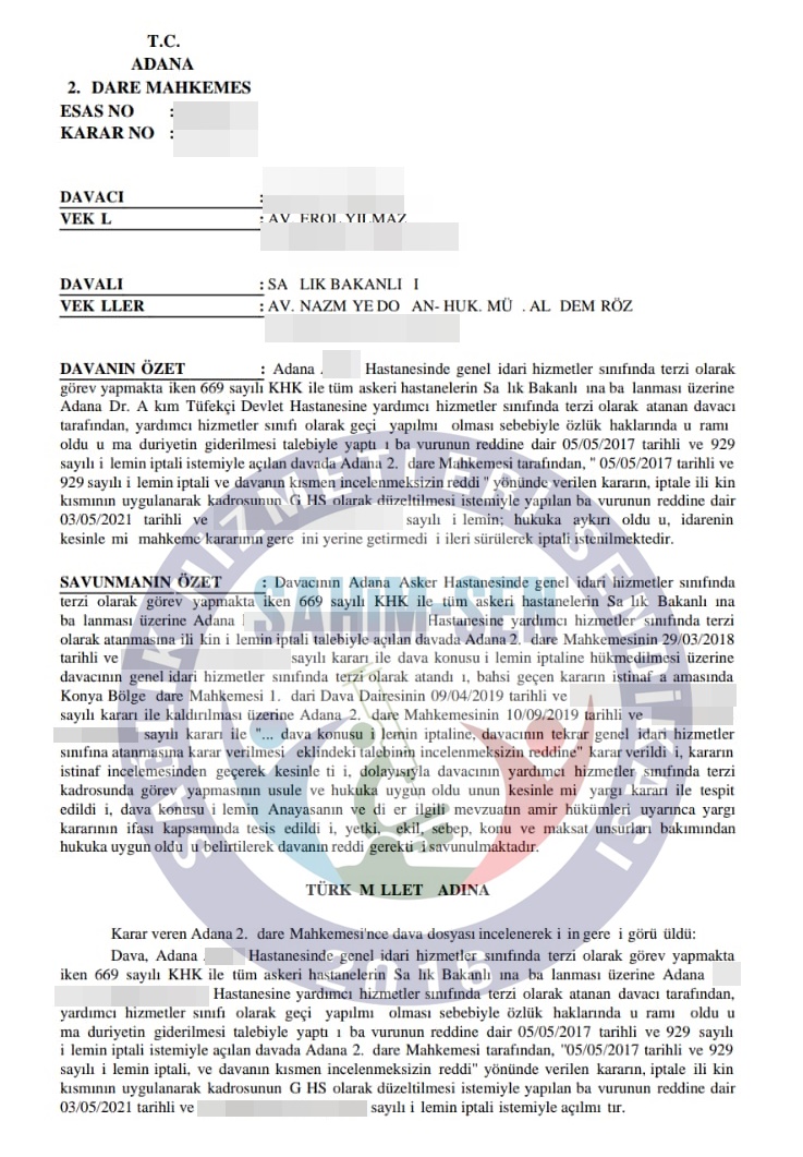 Sınıfı değiştirilen üyemizin haksız hukuksuz olarak yapılan işlemini Adana 2. İdare Mahkemesi iptal ederek iade etti.
