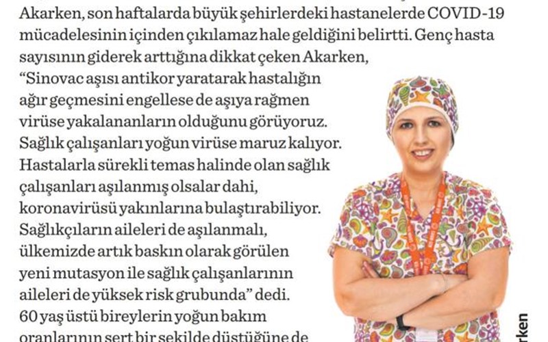 Tüm sağlıkçıların Çin üretimi Sinovac aşısıyla aşılandığını belirten Özlem Akarken, “Sinovac aşısı antikor yaratarak hastalığın ağır geçmesini engellese de aşıya rağmen virüse yakalanan vakalar olduğunu görüyoruz. Hastalarla sürekli temas halinde olan sağlık çalışanları aşılanmış olsalar dahi, koronavirüsü yakınlarına bulaştırabiliyor. Sağlıkçıların aileleri de aşılanmalı, ülkemizde artık baskın olarak görülen yeni mutasyon ile sağlık çalışanlarının aileleri de yüksek risk grubunda” dedi.